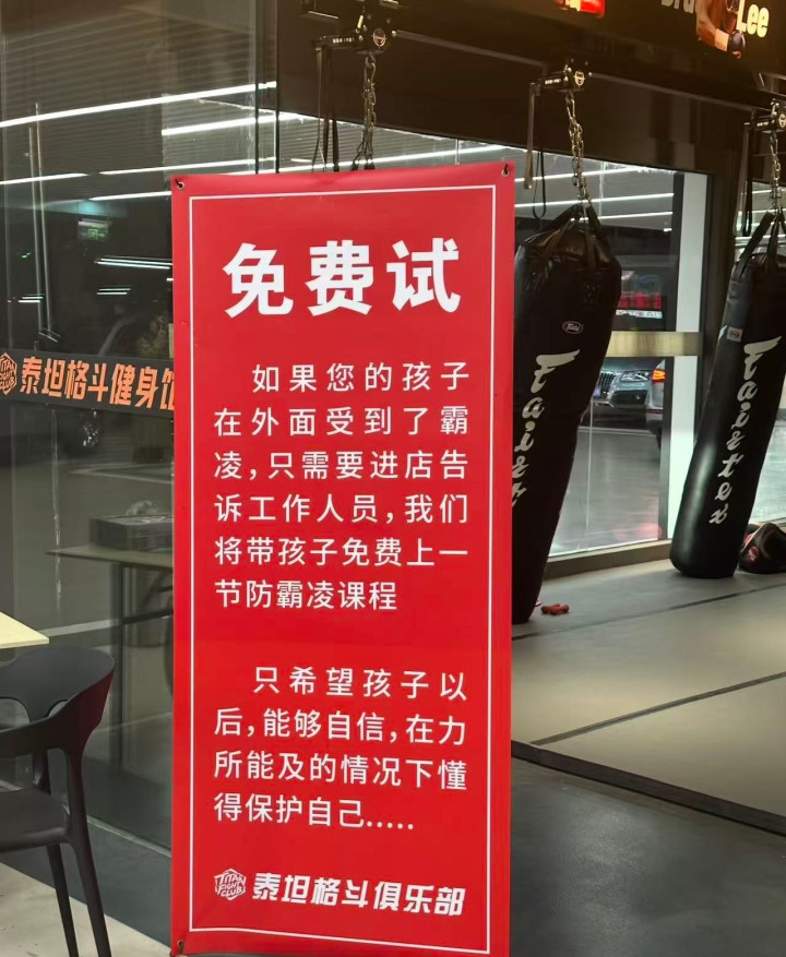 近日,一位来自南宁的网友在社交平台发帖分享,当地的一家格斗俱乐部张贴海报称,如果有孩子在外面受到了霸凌,只需要进店告诉工作人员,教练将带孩子免费上一节防霸凌课程。